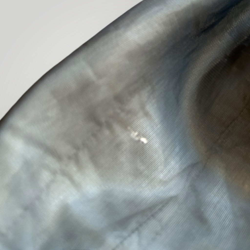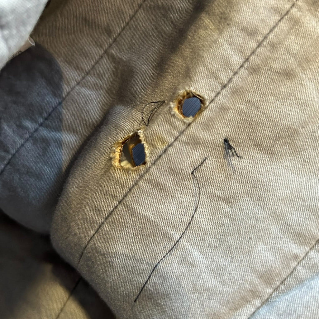- Generally good condition for its age but due to the frangile duel later there is a few small pulls and pin holes, as shown in the pictures. Also has a burn on the inner lining. Neither are noticeable when worn